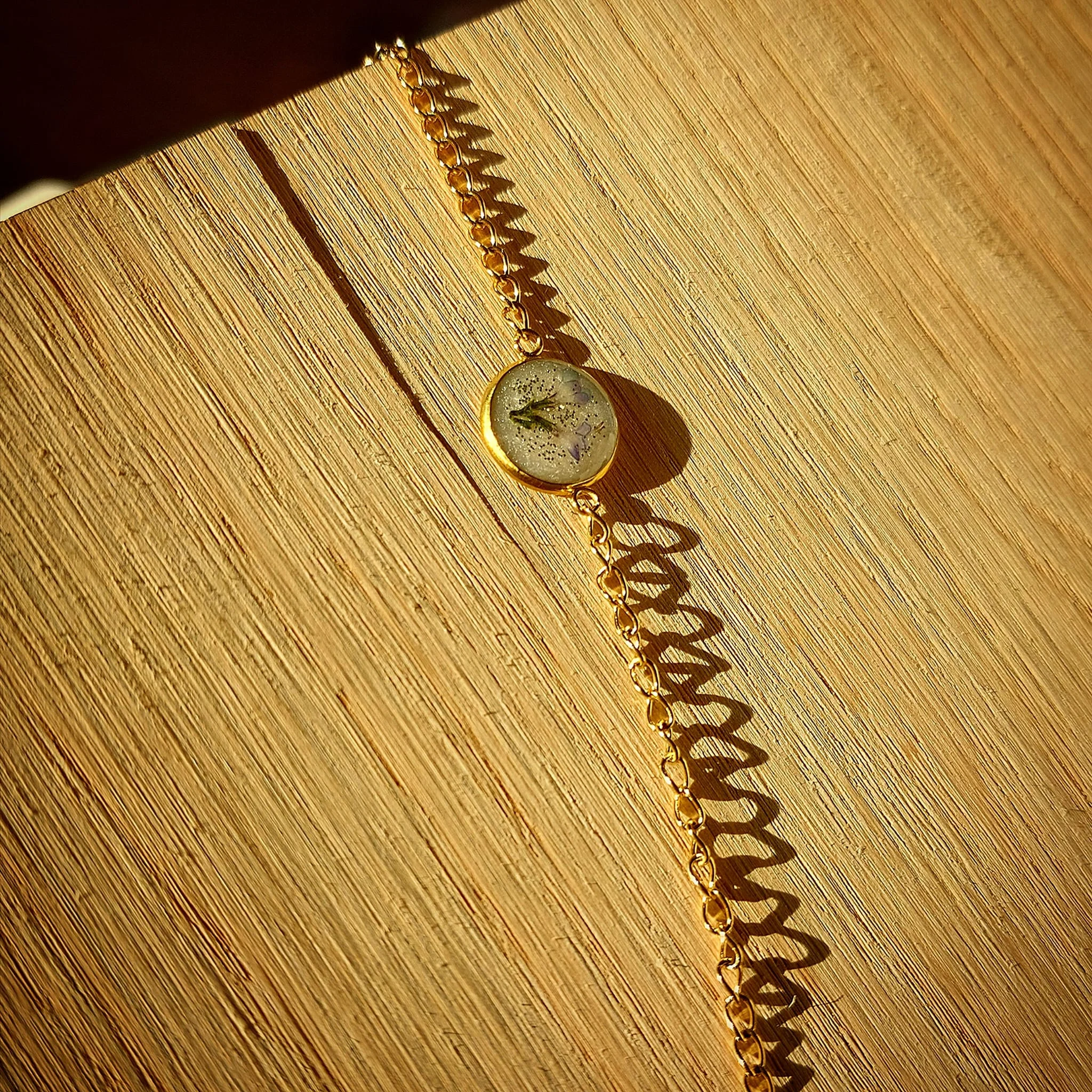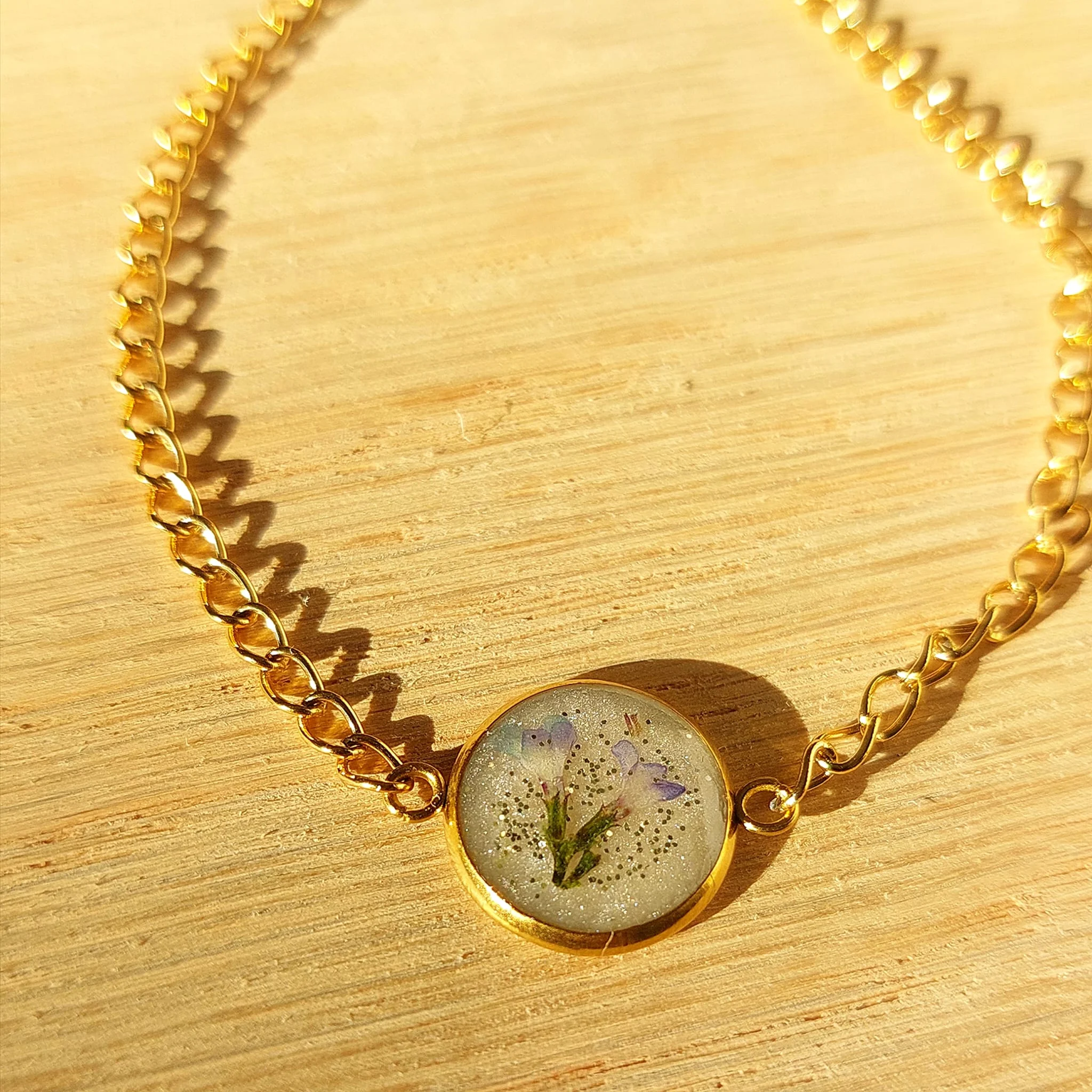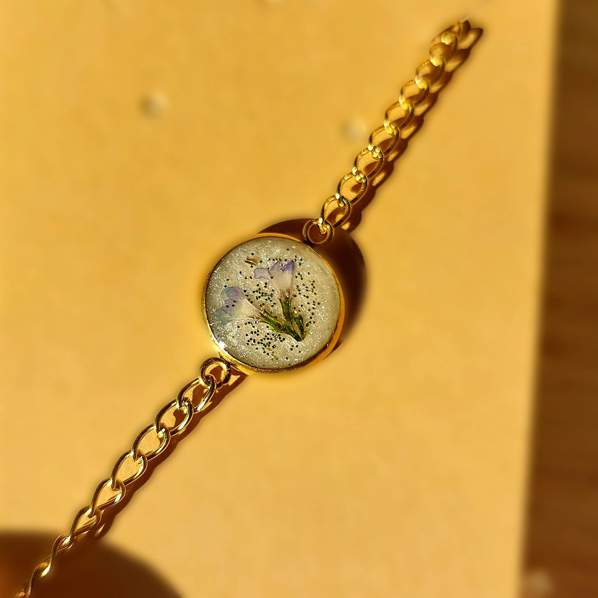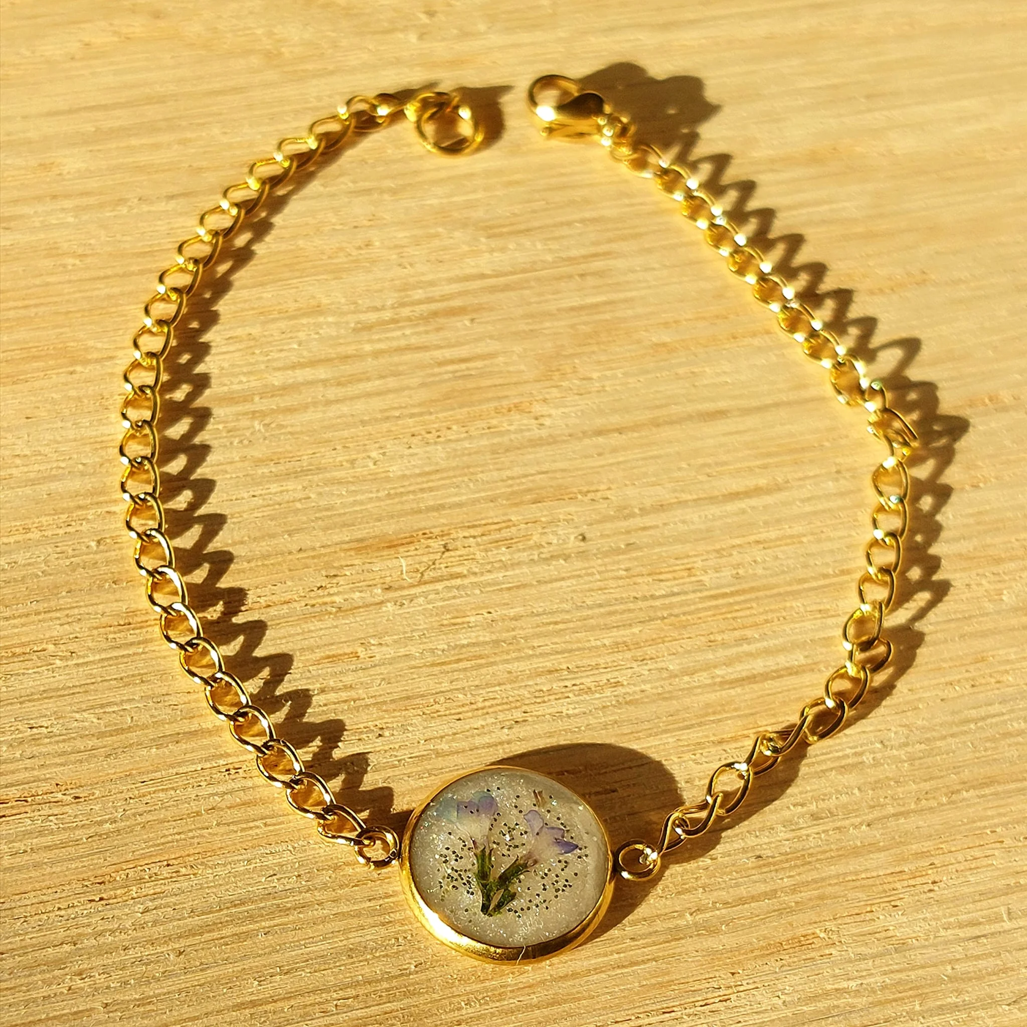 Unikatna narukvica s pravim suhim biljkama u epoxy smoli. Lagane, elegantne i izrađene od nehrđajućeg čelika – savršene za ljubiteljice prirode i ručno rađenog nakita.