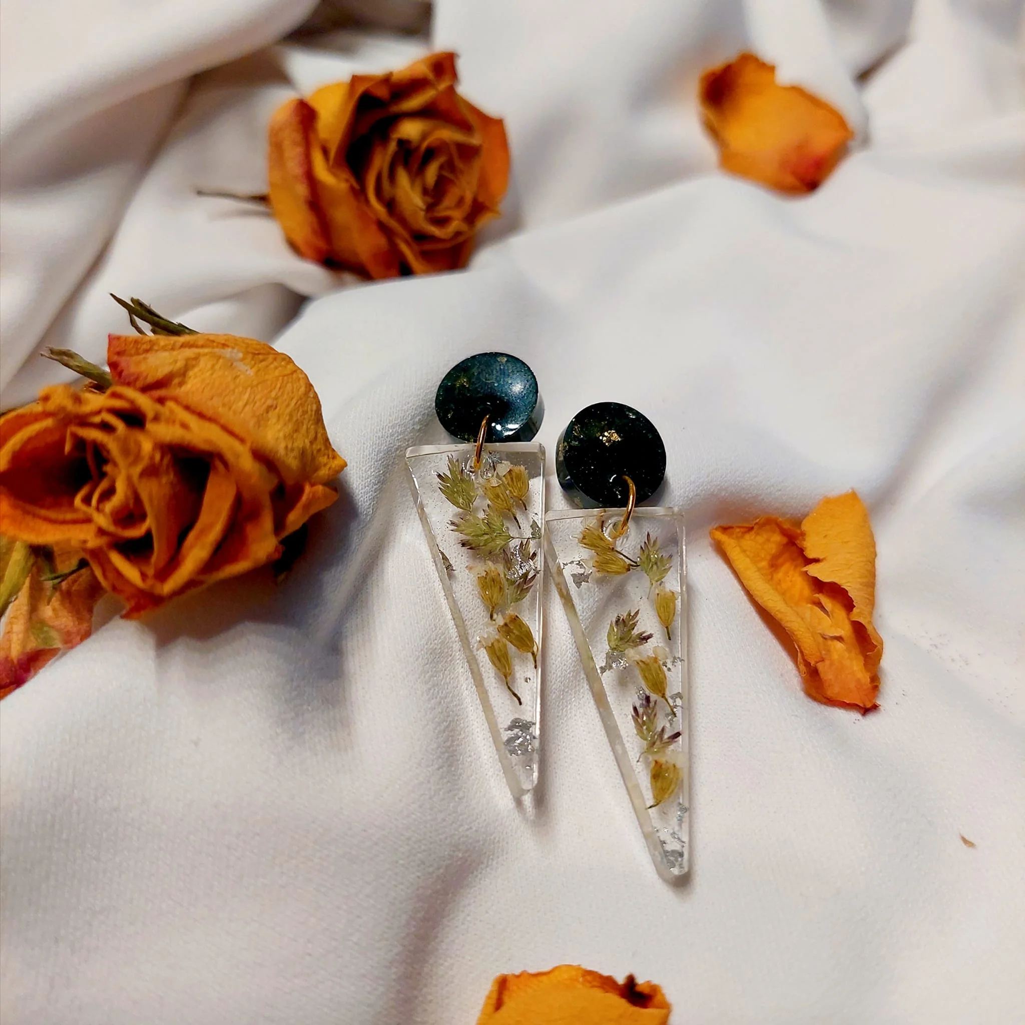 Unikatne naušnice s pravim suhim biljkama u epoxy smoli. Lagane, elegantne i izrađene od nehrđajućeg čelika – savršene za ljubiteljice prirode i ručno rađenog nakita.