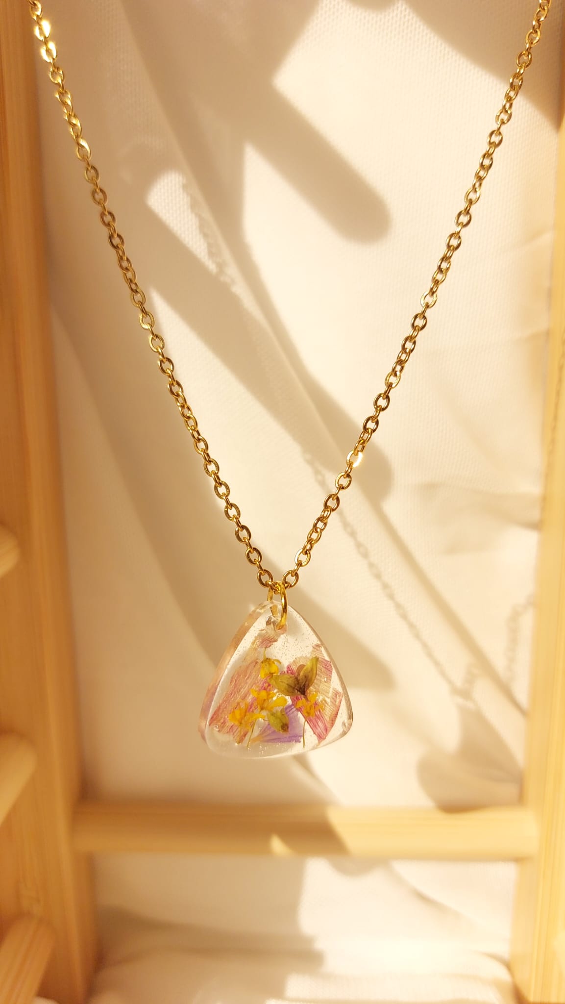 Unikatna ogrlica s pravim cvijećem, sačuvanim u epoxy smoli. Nježan prirodni detalj koji unosi sunce u svaki stil. Ručni rad, lančić od nehrđajućeg čelika.