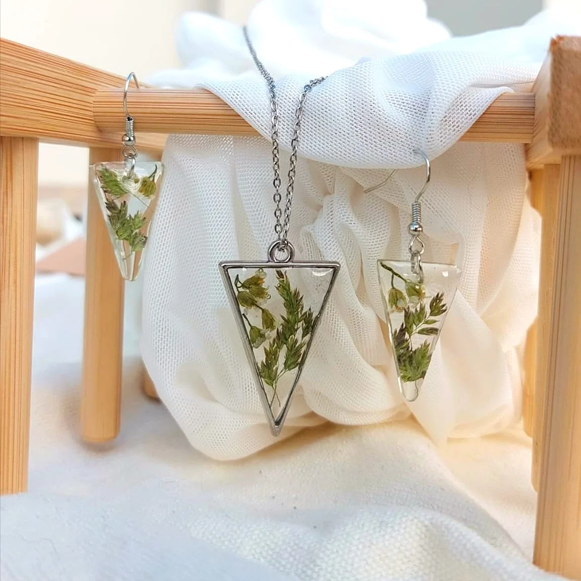 Unikatni set nakita s pravim suhim biljkama u epoxy smoli. Lagan, elegantan i izrađen od nehrđajućeg čelika – savršene za ljubiteljice prirode i ručno rađenog nakita.